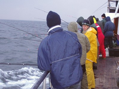 Draussen auf der Ostsee erwartet uns schönes Wetter. Die Fänge lassen auch nicht lange auf sich warten, die ersten Dorsche werden gelandet und auch Heringsschwärme sind auf dem Echolot zu erkennen. Der Käpitän gibt diese Information über den Bordlautsprecher bekannt. Die Angelfreunde haben natürlich die Reserveangel längst mit Heringspaternostern bestückt...