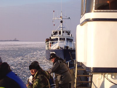 Die "Eidum", das kleinere Schiff im gebrochenem Fahrwasser der "MS Christa". Die Angelfreunde sind voller Begeisterung über die Ausfahrt durch dem vereistem Hafen.
